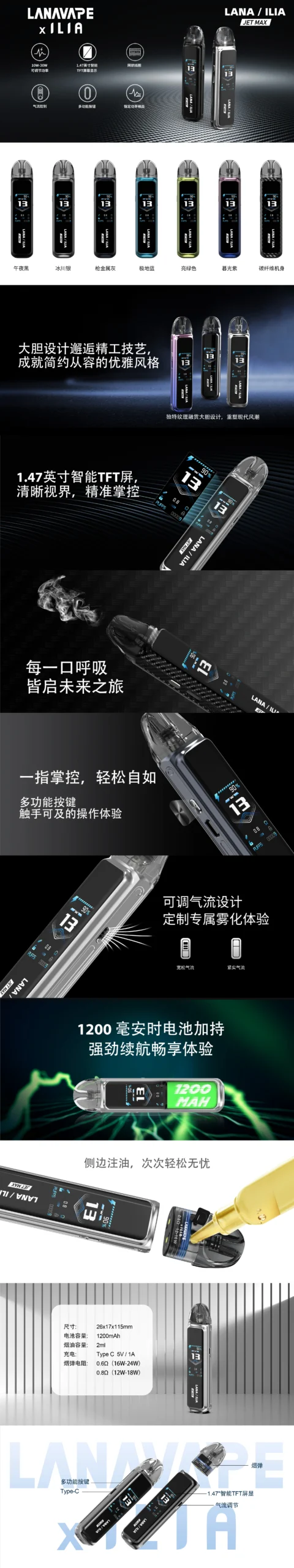 LANA JET MAX 注油主機套裝,搭載 1.47 吋 TFT 螢幕10W–30W 可調功率鬆緊氣流調節,配合多種線圈阻值,滿足從 MTL 小煙到 DTL 大煙 的全方位需求。內建 1200mAh 電池,支援 Type-C 快速充電,續航持久不斷電。