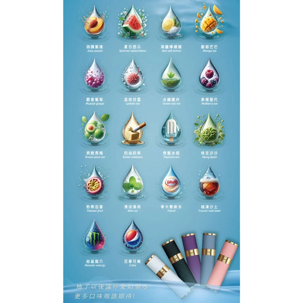 • 18種口味:原味煙草、微醺蜜桃、夏日西瓜、清涼薄荷、桑椹聖代等。